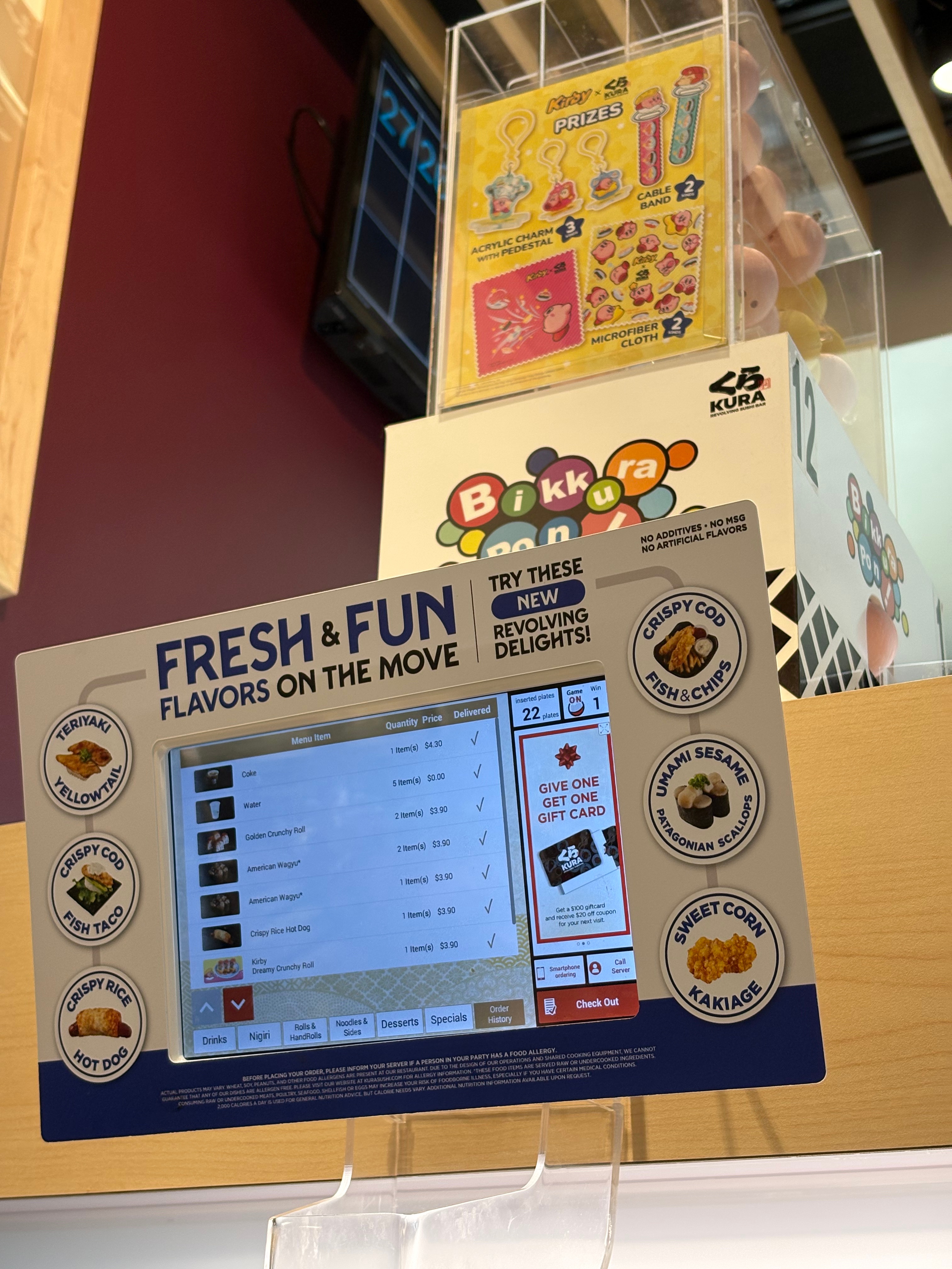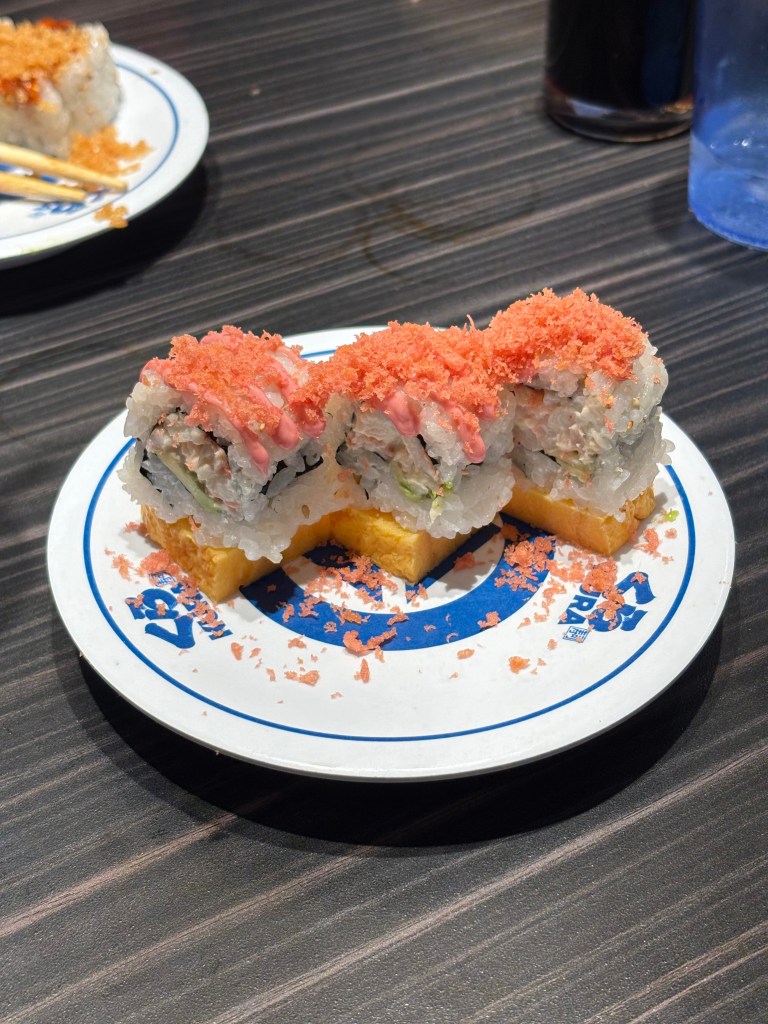 Looking at this photo, this is the Kirby sushi we were able to finally order. We had issues with the conveyor belt not sending us the sushi, but after calling over the waiter, we figured out the sushi problem and got the Kirby sushi! Trying it out, they had pink panko on top to dress the sushi, and has eggs on the bottom, looking kind of like Kirby’s feet! There was then crab on the inside I think and avocado. Not sure if why those ingredients were chosen specifically, but I guess it could be a way to imagine what Kirby tastes like?? I’m not really sure how I feel about that too. Ultimately, I feel that even though I don’t know what the sauce on it tastes like, I think it ended up tasting good in total and also looked kind of like Kirby!